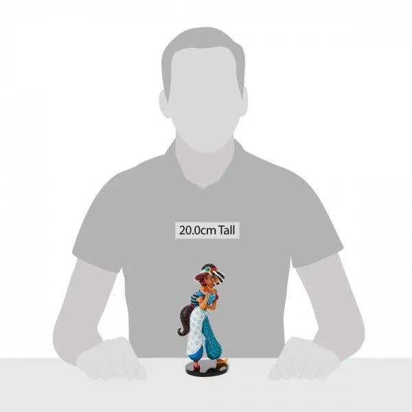 Jasmine. The young, free-spirited princess from Disney’s classic Aladdin is seen here in her iconic blue outfit, lovingly reimagined by contemporary pop artist Romero Britto. The Jasmine figurine is made of cast stone. The product comes in a gift box. Unique variations are to be expected as the product is hand painted. Not a toy or children’s product. Intended for adults only.