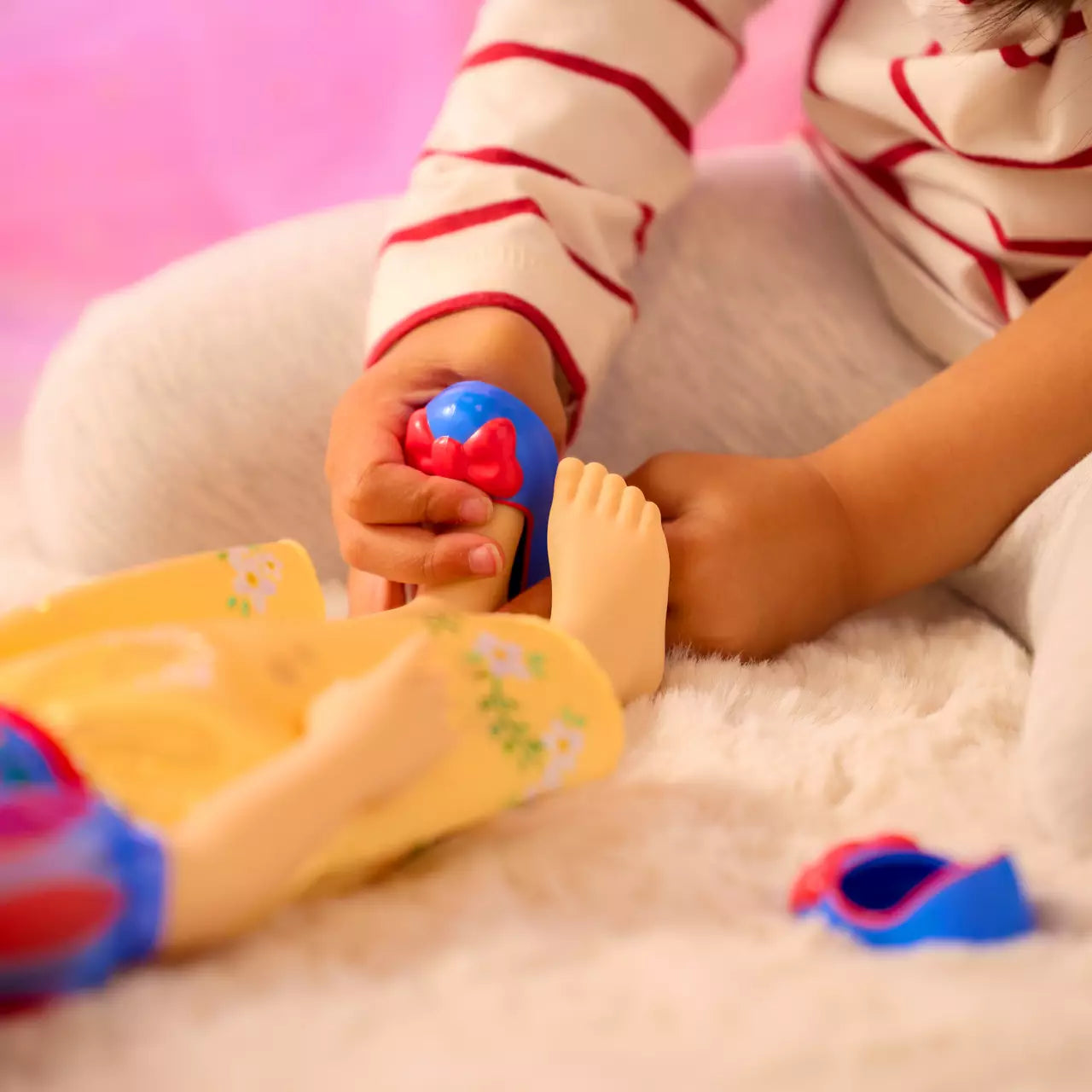 The Disney Once Upon a Story collection celebrates the power of imagination and storytelling with beloved fairytale friends. Hours of magical adventures await with the stories you create! Snow White, dressed in a detailed satin costume with fanciful trims and iridescent foils, is depicted in her younger years before escaping from her wicked stepmother to the enchanted forest to meet new friends and make her fondest wishes come true.