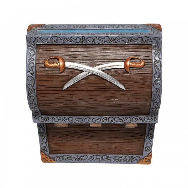 Inspired by the Disney classic film, Peter Pan, Captain Hook and his man Smee row across a golden treasure in a chest bearing the mark of Skull Island in this beautifully detailed scene from the artistry of Jim Shore.
