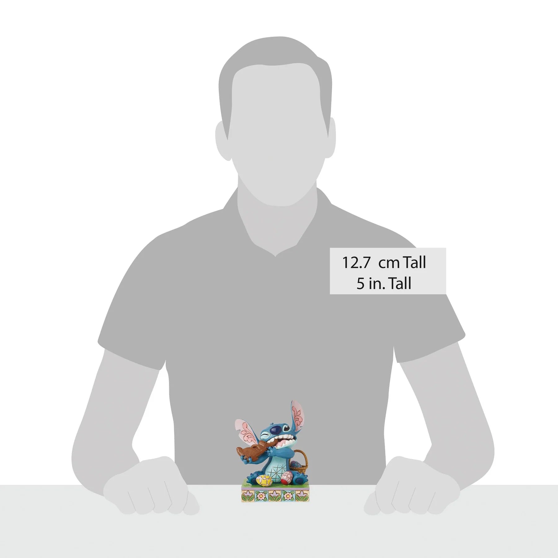Delight in the whimsical charm of Jim Shore as Stitch the alien indulges in Easter festivities, surrounded by a colorful array of Easter eggs. With mischief twinkling in his eyes, Stitch gleefully nibbles on a chocolate bunny with contagious joy.