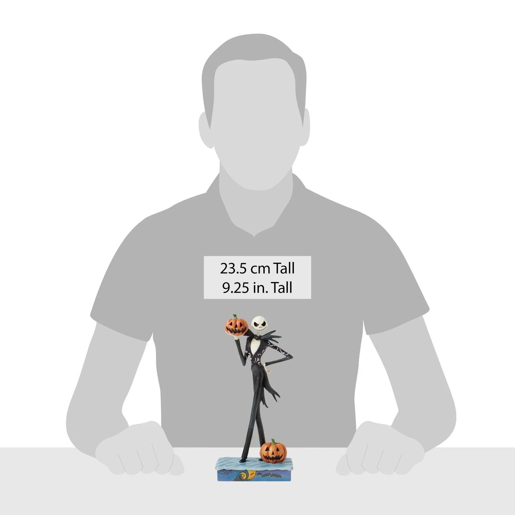In this captivating Jim Shore design, Jack Skellington, clad in a striking black and white suit, exudes charm with a mischievous grin as he holds a Jack-o-lantern. Bring home Jim's newest The Nightmare Before Christmas designs.