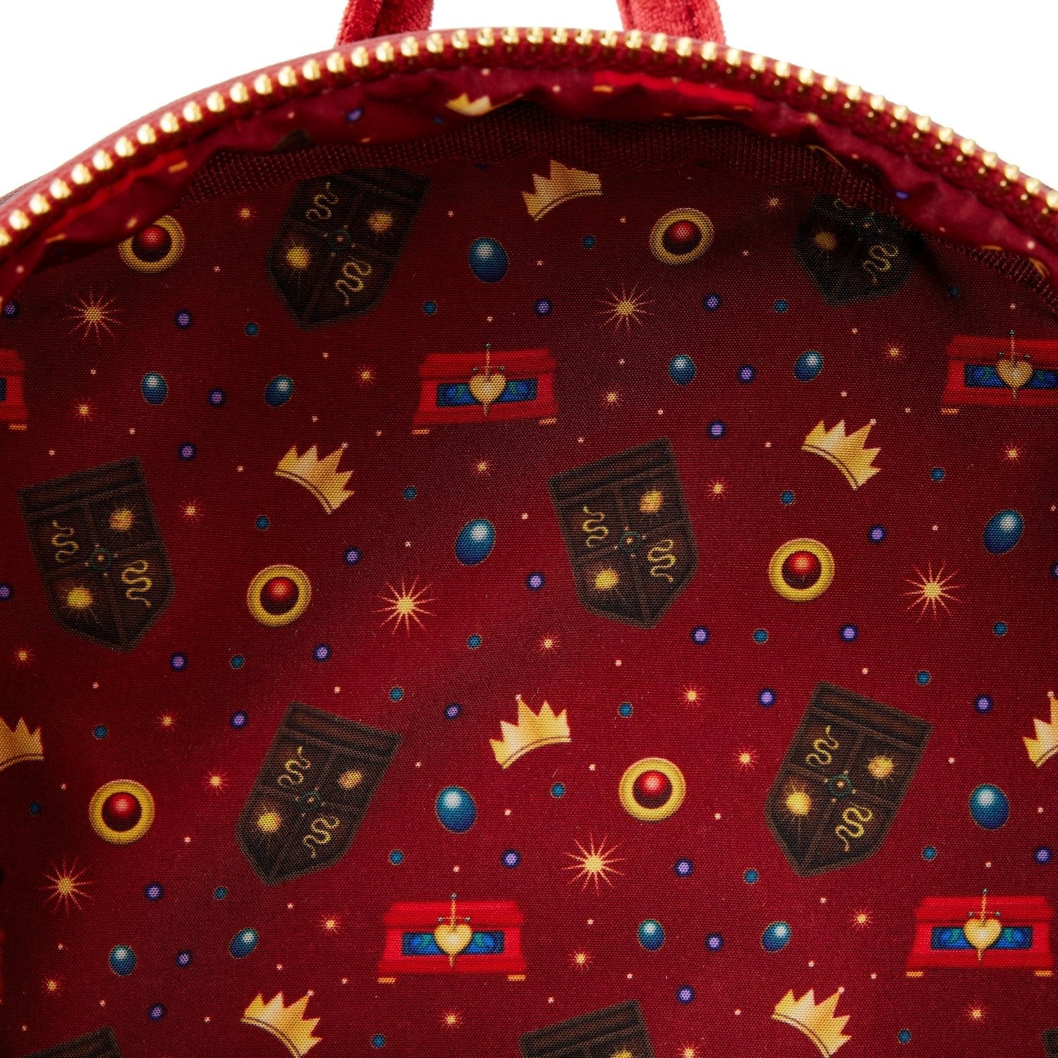 Elegantly evil and ready to rule! Bring on the reign with our Loungefly Disney Snow White Evil Queen Throne Mini Backpack! The Evil Queen is looking particularly regal in the throne room. All artwork on this backpack is original and hand-drawn in-house by our artists. Applique, gold-foil, and velvet details add lush, exquisite accents. A circle of peacock feathers surrounds the Evil Queen on the front zipped pocket. The box, meant to keep Snow White’s heart, rests on a step just below the Evil Queen’s throne. The side pockets include red curtain details from the throne room, along with the Evil Queen’s coat of arms. On the back, you’ll find a beautifully illustrated portrait of Snow White, who is singing to a bluebird, while the Huntsman waits in the background. Keep your favourite animated moments close while adding wickedly royal fun to your everyday outings.