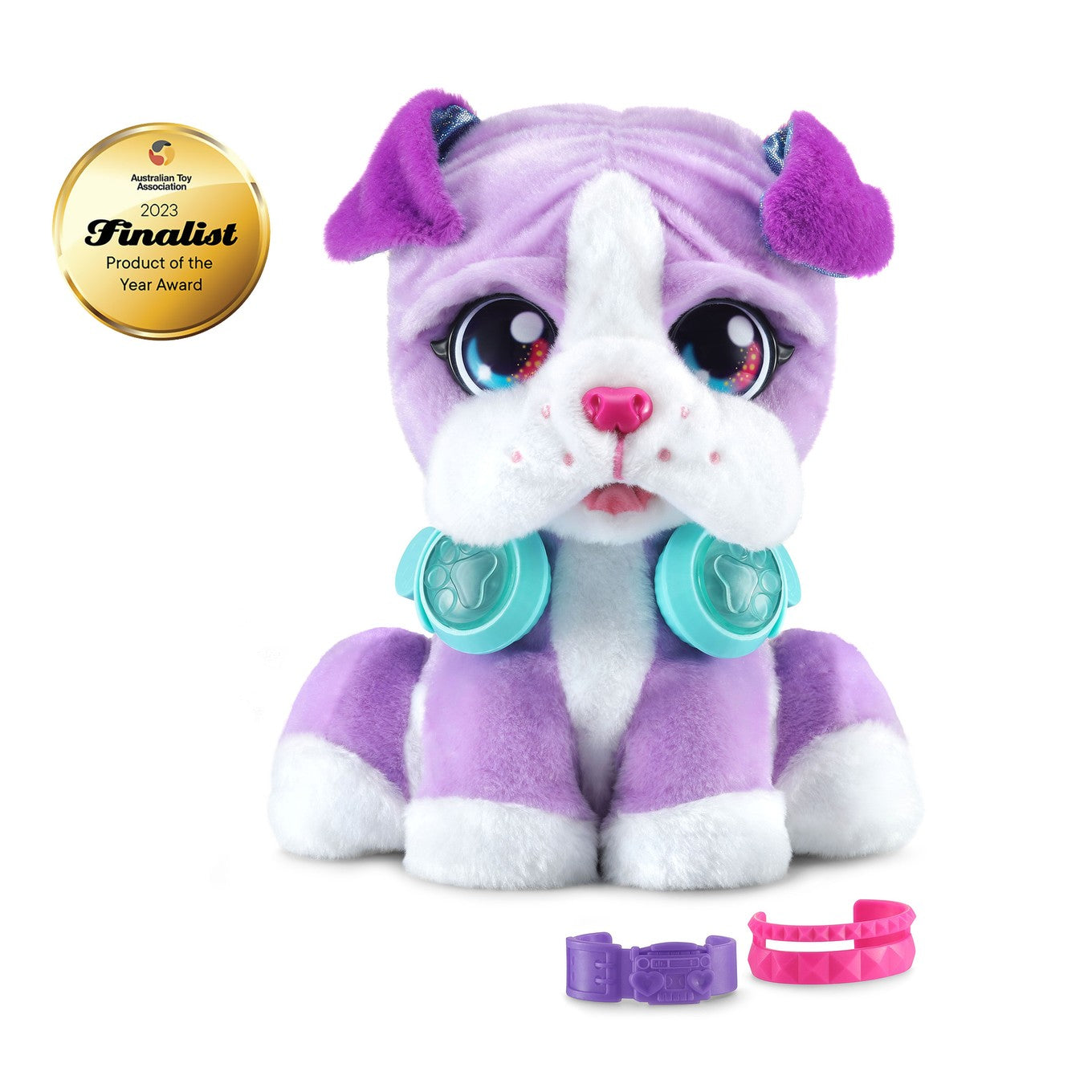 DJ Beat Boxer is a pawsome new musical friend. DJ's a music-mixing pupper, so scratch her head, boop her nose, shake her paw, press her ear or push the buttons on her headphones. Each interaction adds layers to the music so you and DJ can create a new song together! Press her headphones buttons to start a rhythm and add in backbeats or harmonies. Add more cool sounds like record-scratching sounds by scratching her head or touch her nose for an air horn effect. You can even press DJ's ear to record a quick phrase to drop into your song. Her head will nod along to the music while her jowls flap to the beat. Give DJ lots of love and she’ll bark, sneeze and more. Cuddle DJ or create a mix that moves you!