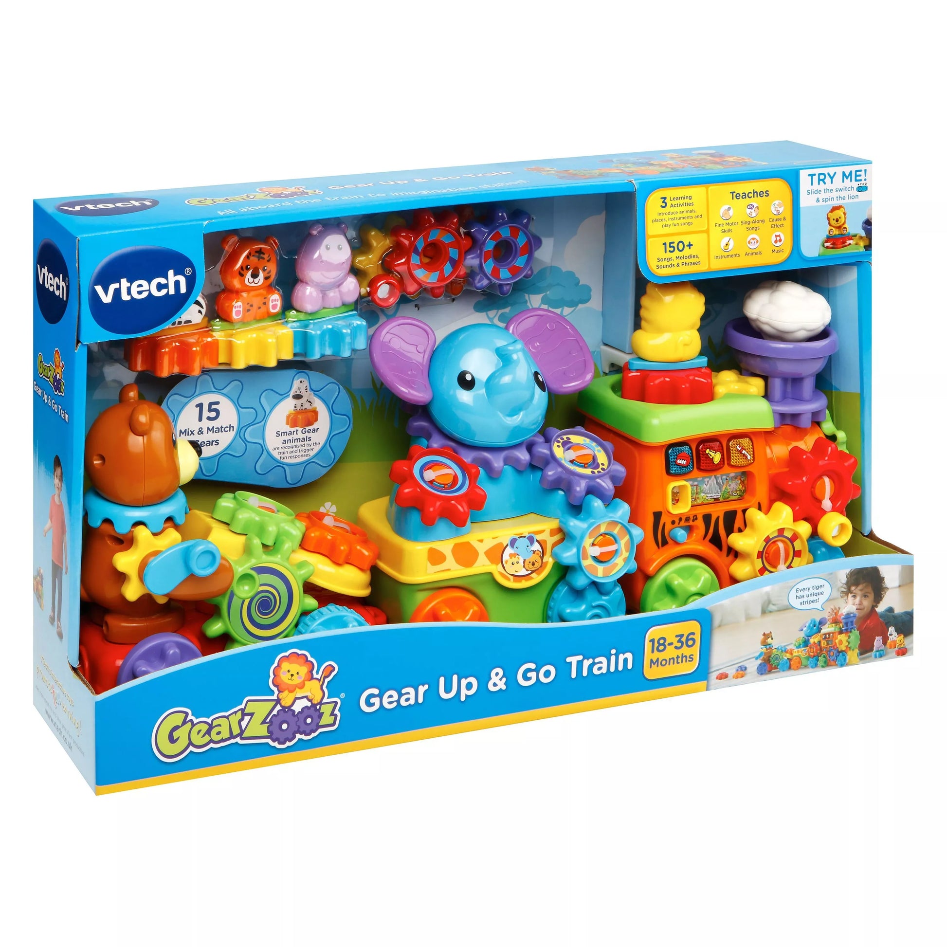 Hop aboard the Gear Up & Go Train, where connecting 15 assorted gears helps develop fine motor skills and allows children to build their own vibrant gear train. Placing animal gears on the smartpole activates animal sounds and facts, teaching cause and effect. The train offers three play modes featuring music, engaging locations, and a quiz for learning. Interactive light-up instrument buttons and an activity slider respond differently across modes. Pull the train to enjoy a sing-along song, and turn the gear handle to play various melodies. Suitable for children aged 18 to 36 months.